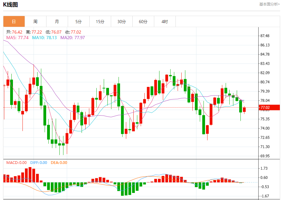 原油市场:截止北京时间21:08,美油上涨,现报77.08,涨幅0.97%。纽市盘前,原油价格在前几个交易日触及75.65水平后强劲反弹,将再次测试图表中出现的双顶形态的破颈线,位于77.40。