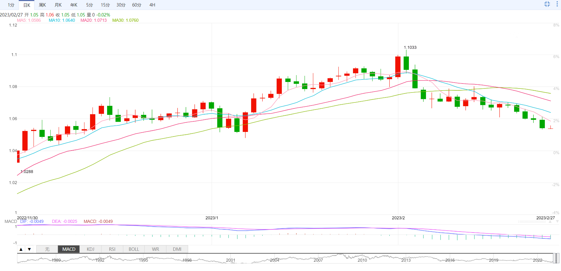 欧元/美元了无生气,盘整于1.0550附近。上週五公佈的美国消费者支出数据意外上升引髮美元大幅下跌后,欧元/美元波动已受到挤压。劳动力市场紧张,美国企业为招到人才不断上调薪资,提振家庭支出。这引发市场担忧美联储(Fed)继续实施紧缩政策。美元指数维持低迷处在104.80附近,正在等待美国耐用品订单数据,以获取新的线索。相对强弱指标(14)自40.00-60.00范围降至20.00-40.00,表明欧元/美元出现下跌势头。