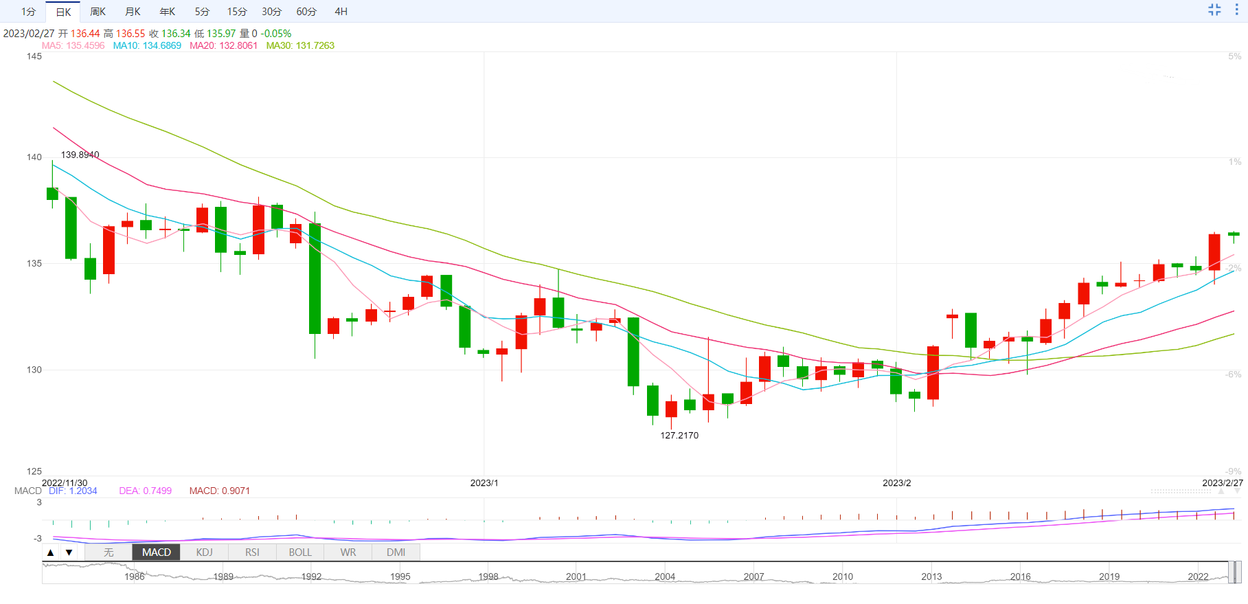 一些交易员在达到费波纳奇回档位136.65时了结获利,136.65是2022年10月21日至今年1月16日跌势151.94-127.21的38.2%回档位,上方阻力在137.00-15--100日移动均线137.08、200日移动均线137.14。