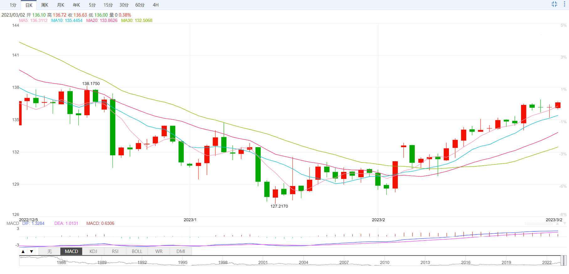 美元/日元力图克服前两天平淡走势,多头维持在136.30附近。在此过程中,日元/美元继自50移动均线(SMA)和两周水平支撑区反弹后小幅上涨。不仅是自关键技术位持续反弹,而且MACD信号看跌倾向回落也对多头有利。鉴于此,美元/日元这一风险晴雨货币对很有可能测试2月初以来的上行倾向阻力线,截至发稿时接近137.30。