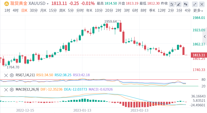 周三亚盘,黄金交投于1813.11附近。金价周二下跌近2%,美联储主席鲍威尔在向国会委员会作证时表示可能以更快的步伐加息后,美元跳涨。美联储主席鲍威尔周二对美国立法者表示,美联储很可能需要比预期更大幅度的提高利率以应对最近的强劲数据,并准备在未来“整体”信息表明需要使用更严厉措施来控制通胀时,采取更大力度的行动。