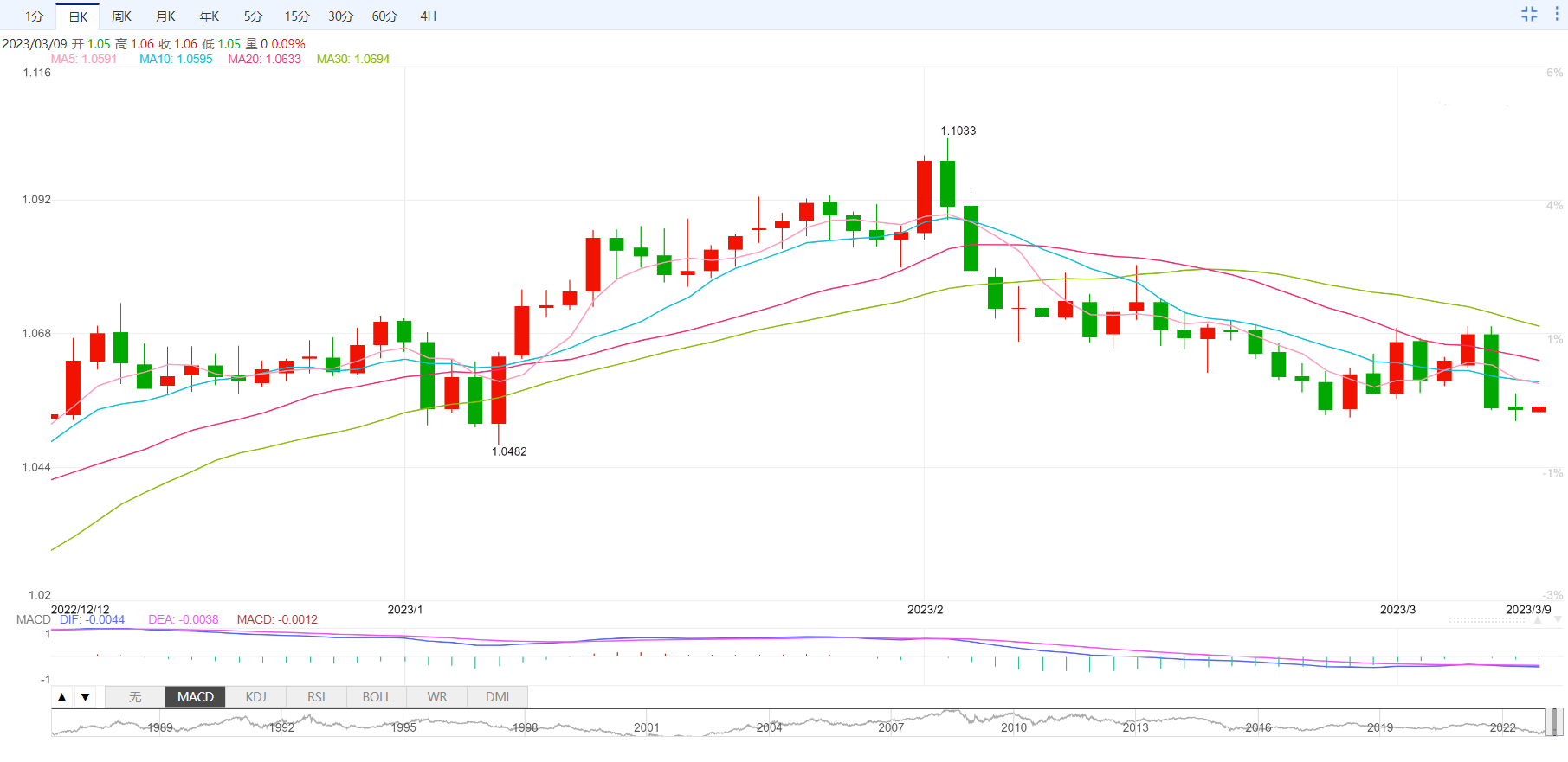 欧元/美元徘徊于1.0550附近,即便前日欧元/美元自2023年1月以来的最低水平反弹后有所回落,但周四早盘交易低迷,技术信号不明朗对投资者构成挑战。欧元/美元週三跌至两个月新低,随后反弹至1.0524。然而,当日欧元/美元收盘后,欧元/美元较开盘水平变化不大,因此构筑十字星K线,表明欧元/美元将出现整理反弹。