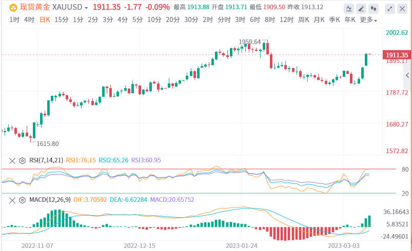 周二亚盘,黄金交投于1911.35附近。黄金和白银价格周一大涨,因为它们的避险魅力吸引了被硅谷银行倒闭吓坏的投资者,这场危机还引发了人们对美联储将不得不对其积极的货币政策踩刹车的希望。交易员们不再预期美联储下周会加息50个基点,目前的预测是加息25个基点,有些人甚至预期根本不会加息,这使得黄金更具吸引力,因为它不会产生任何利息。