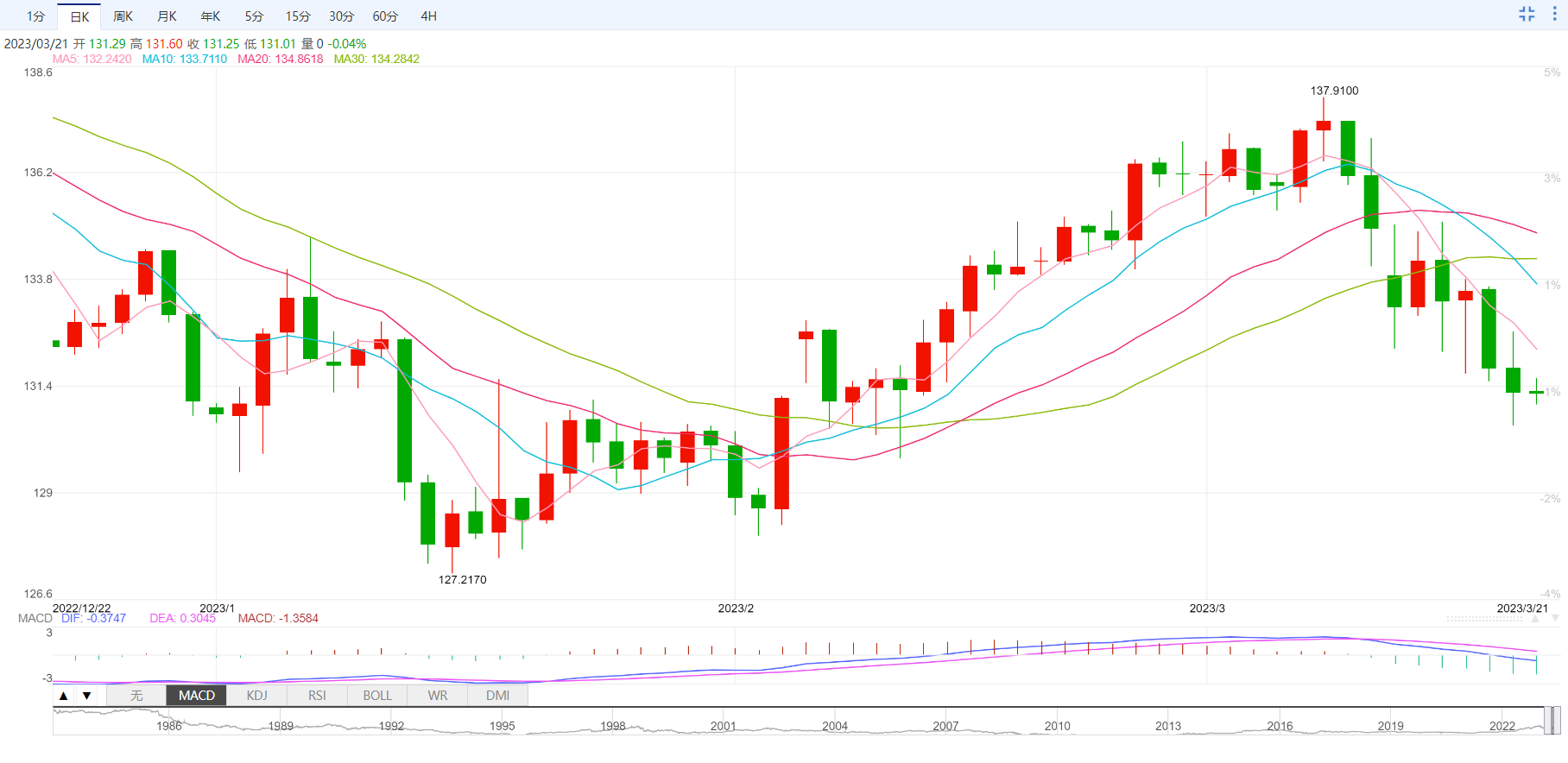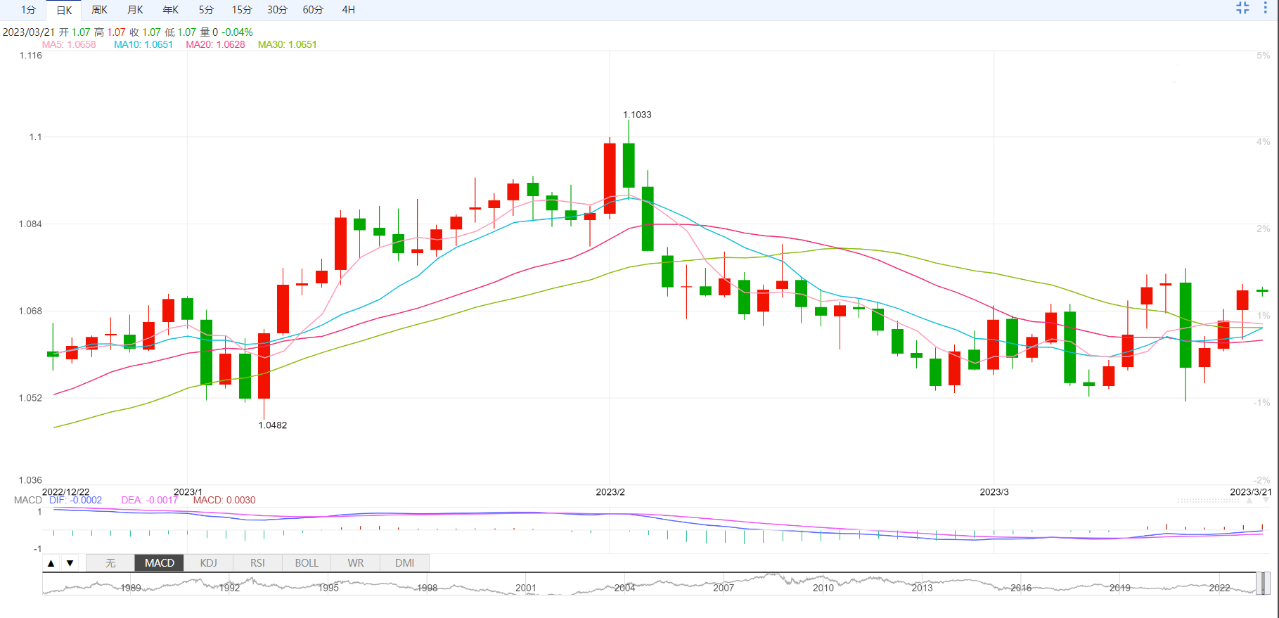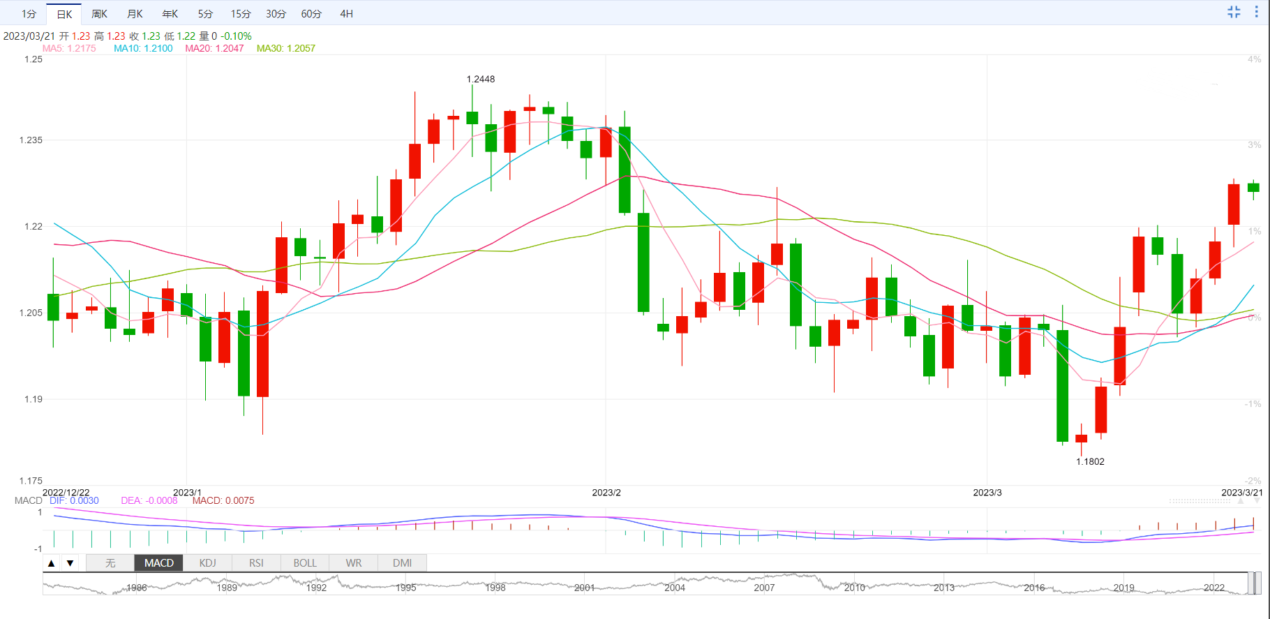 欧元/美元持续窄幅震盪于支撑位整数关1.0700上方。美联储利率决议之前,投资者似乎处在观望当中。因此欧元/美元正维持美联储决议公佈前的波动,有望延续观望。欧元区通胀预期得以上调,增强了欧洲央行(ecb)继续提高利率的理由。投资者应该知道,儘管瑞信破产,但欧洲央行上週仍将利率上调50个基点至3.5%。除此之外,投资者还对欧元区银行在瑞士信贷危机中的风险敞口感到好奇。据路透社报导,欧洲央行行长拉加德称,欧元区银行对瑞士信贷的敞口是数百万欧元,而不是数十亿欧元。