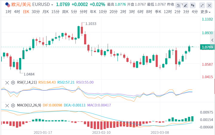 欧元:截止发稿,欧元/美元徘徊于1.0769附近,昨日欧元/美元走高,收报1.0765,涨幅0.45%。在欧元区方面,银行业的崩溃损害了市场参与者的情绪。考虑机构投资者情绪的欧元区ZEW调查在经历了五个月的上涨后跌至10.0。技术面上,汇价上行的初步阻力位于1.0801,进一步阻力位于1.0837,关键阻力位于1.0886;汇价下行的初步支撑位于1.0717,进一步支撑位于1.0668,更关键支撑位于1.0633。