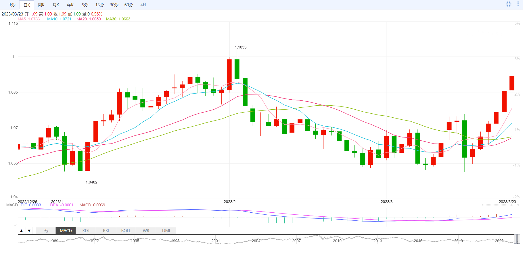 利率期货市场显示再升息一次的机率为50%。这与欧洲形成鲜明对比,市场预期欧洲央行还需要再升息50个基点左右,欧美利率前景的差距,刺激欧元飙升,周三触及1.0912美元的七周高点,并在亚洲时段接近再次测试1.0910美元。