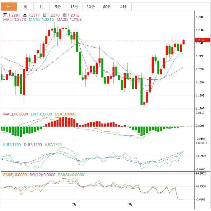 英镑兑美元周一走高0.4%,收报1.2278,此前英国央行行长贝利周一表示,利率制定者将专注于对抗通胀,不会被对全球银行系统健康状况的担忧所过度影响。周二亚市,截止8:00,英镑兑美元一度上涨0.17%,至1.2299。