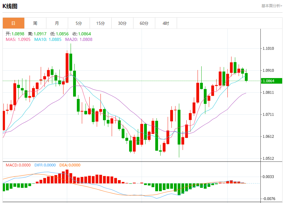 欧元/美元:截止北京时间20:52,欧元/美元下跌,现报1.0865,跌幅0.30%。纽市盘前,在前几个交易日中,欧元兑美元没有表现出任何强劲的波动,继续在日内看涨通道支撑线波动,因此,对未来一段时间的预期看涨趋势没有改变,目标是1.1032作为下一个主要位置。