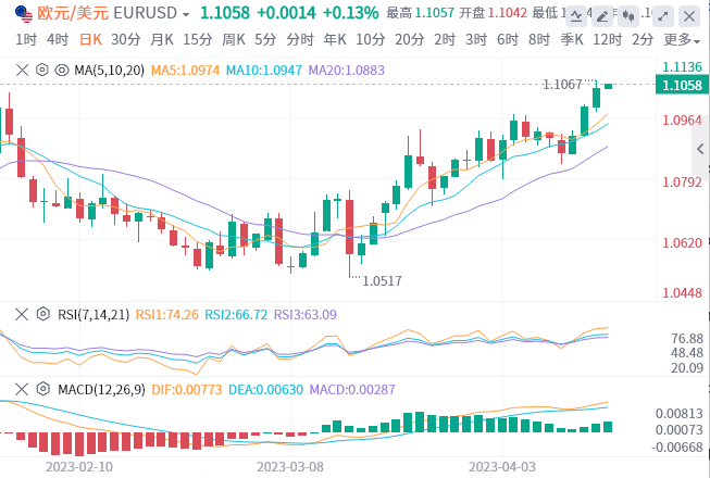 美元指数:截止发稿,美元指数交投于100.980附近。由于美国消费者价格指数(CPI)令人失望,3月份美国生产者价格指数(PPI)降至月环比-0.5%的四个月低点,而此前预期为0.0%。此外,PPI年环比也从之前的4.9%降至2.7%,而市场预测为3.0%。此外,美国首次失业申请人数从预期的23.2万人和之前的22.8万人上升至23.9万人,这也影响了美联储的鹰派押注和美元。技术面上,21天指数移动平均线(EMA)出现明显的180度大转弯,截至发稿时约为102.35,使美元指数突破100.80的年低点。