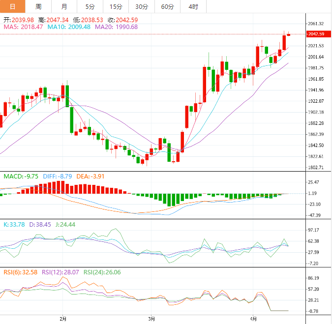 技术面:20期指数移动平均线(EMA)上涨至2031.00美元,有利于黄金多头有更多上行空间。相对强弱指数(RSI)(14)在60.00-80.00的看涨范围内振荡,表明上行势头已经活跃。