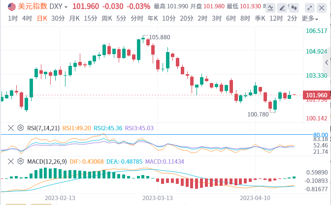 美元指数:截止发稿,美元指数交投于101.960附近。最近更为坚定的美国数据和鹰派的美联储谈判有利于市场押注央行5月加息0.25%,并降低2023年降息的可能性。其他主要央行对通胀和加息的担忧也推动了美元的避险需求。技术面上,尽管美元指数从100.80的双底反弹,但21-DMA和一个月前的阻力线分别在102.15和102.35附近,在迎来多头之前,对美元的复苏提出了挑战。