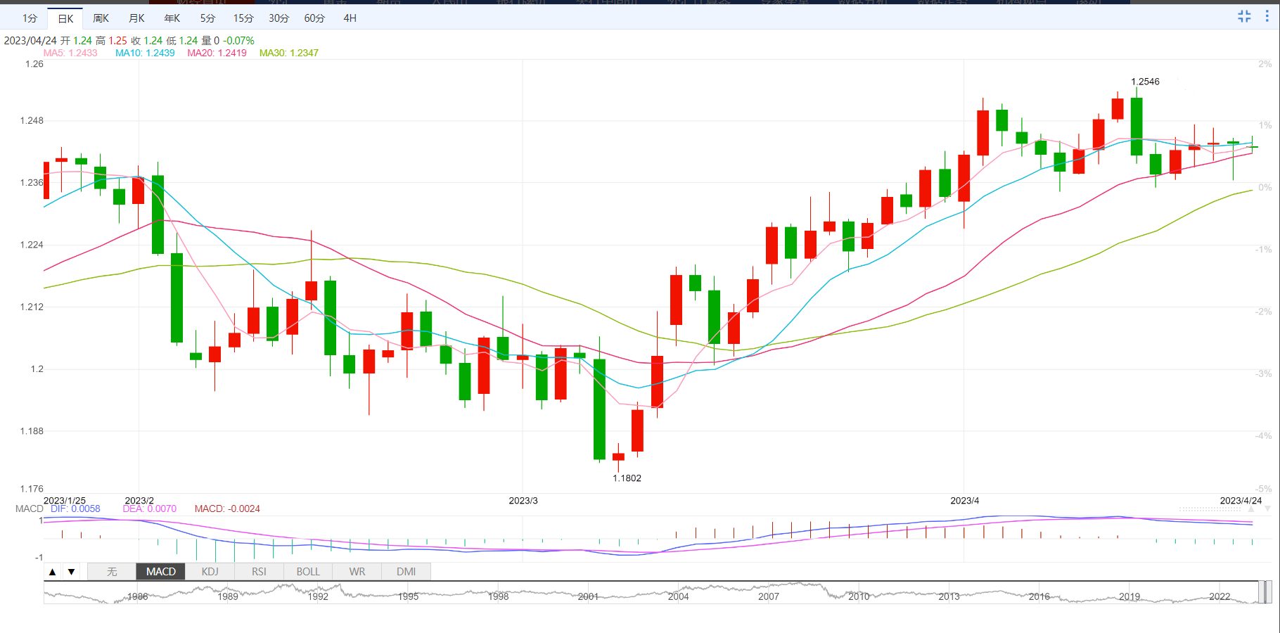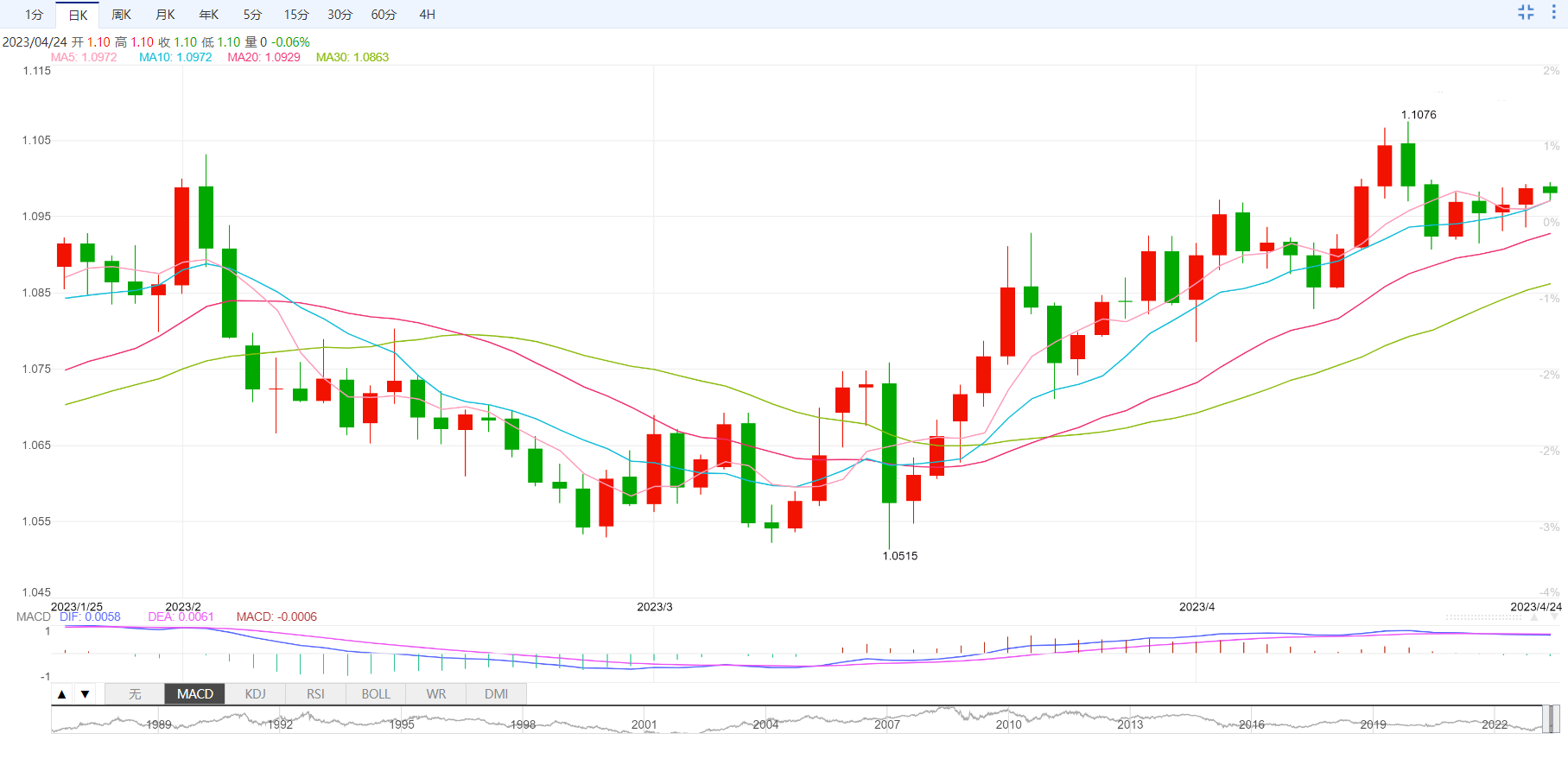 美元指数在回升后刷新了当天的高点101.82。从更广泛的角度来看,美元指数在过去四个交易日中在101.63-102.27的更大范围内进行盘整。美元指数已经延续反弹突破101.80上方,因为上周公布标普採购经理人指数初值强劲加强了美联储推出更多加息的必要性。展望后市,美国耐用品订单数据将受到热切关注。 3月耐用品订单预计将达到0.8%,而前值为-1.0%。如果耐用品订单数据强劲将表明前瞻性需求强劲,这可能会进一步推升劳动力需求。