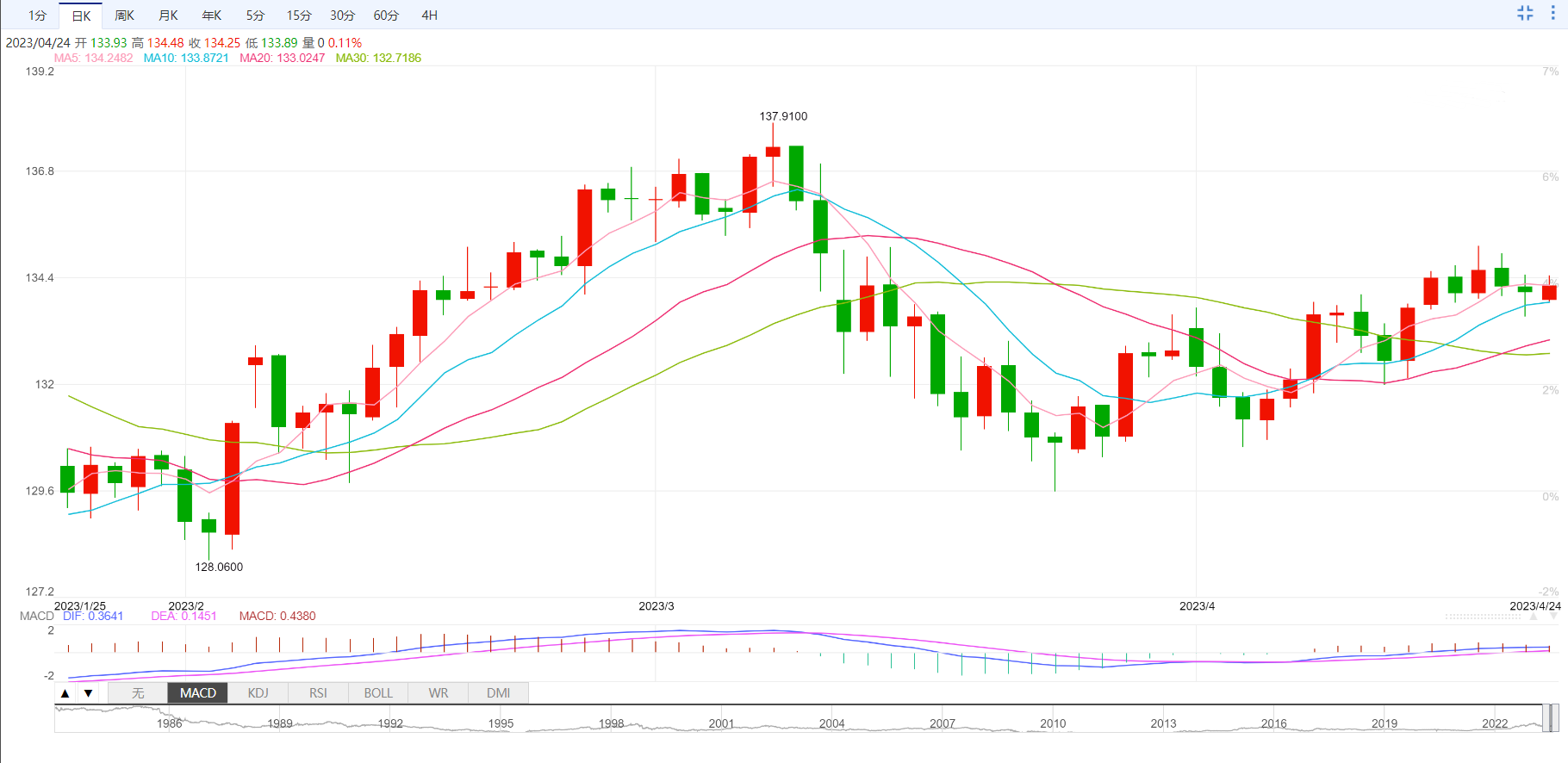 美元/日元正力图夺回紧邻阻力134.50。日本央行行长植田和男重申了保持货币政策扩张的必要性,美元/日元获利动能。日本央行行长植田和男强烈支持继续执行长达10年的超宽鬆货币政策,因为其预计日本的通货膨胀将提前达到峰值。