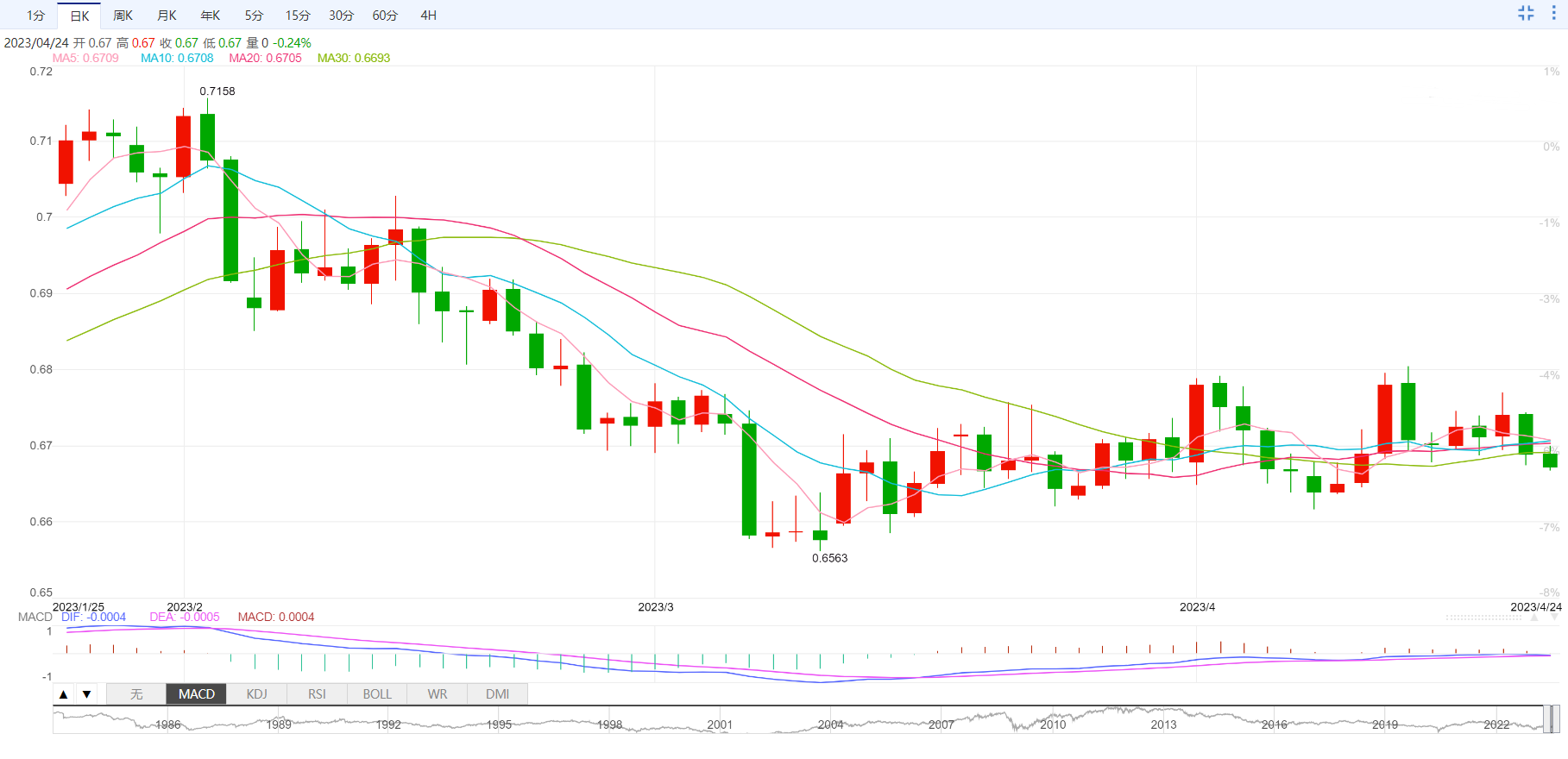 澳元兑美元目前下跌0.16%至0.6681,上周五下跌0.7%,最低至0.6677,为4月12日以来新低。澳元在0.6750面临阻力,而主要支撑位于0.6620。