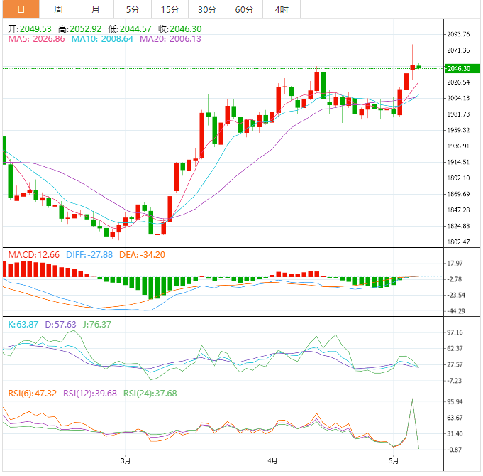 技术面:金价在需求区附近获得支撑,维持在2,050.00美元附近的窄幅区间。金价刷新历史高点2,079.77美元后大幅下跌。处在2,047.00美元的10期指数移动均线(EMA)正构成支撑。