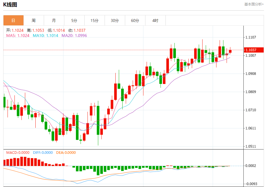 欧元/美元:截止北京时间20:25,欧元/美元上涨,现报1.1038,涨幅0.18%。纽市盘前,欧元兑美元在1.1010处形成关键支撑的EMA50上方稳定,等待获得有助于推动价格恢复看涨倾向的积极动力,并初步访问1.1075,提醒您超过该水平将推动价格到1.1150作为下一站。