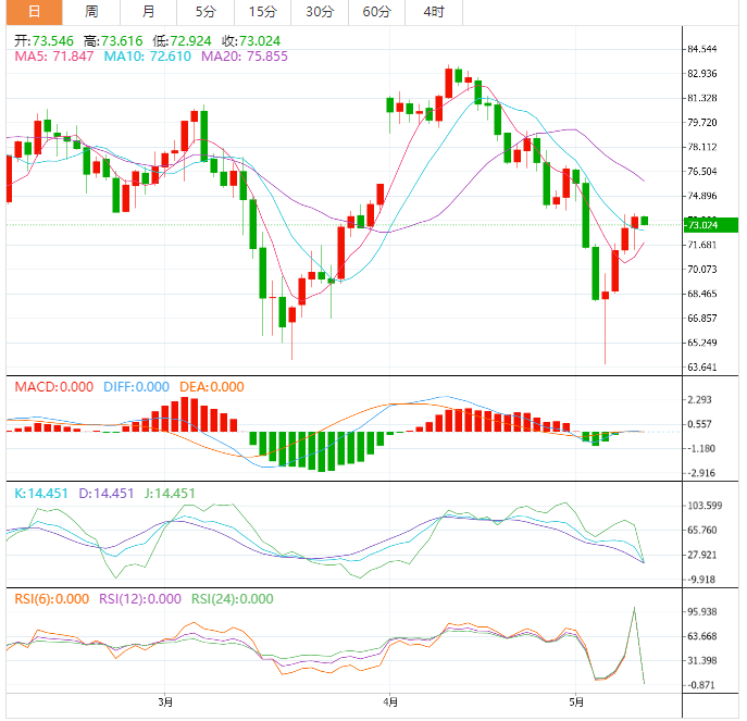 油价周三早盘下滑,美原油目前交投于73.14美元/桶附近,跌幅约0.5%,此前行业数据显示美国原油库存意外增加,同时投资者在等待美国4月通胀数据,该数据可能为美联储的下一次利率决定提供方向。