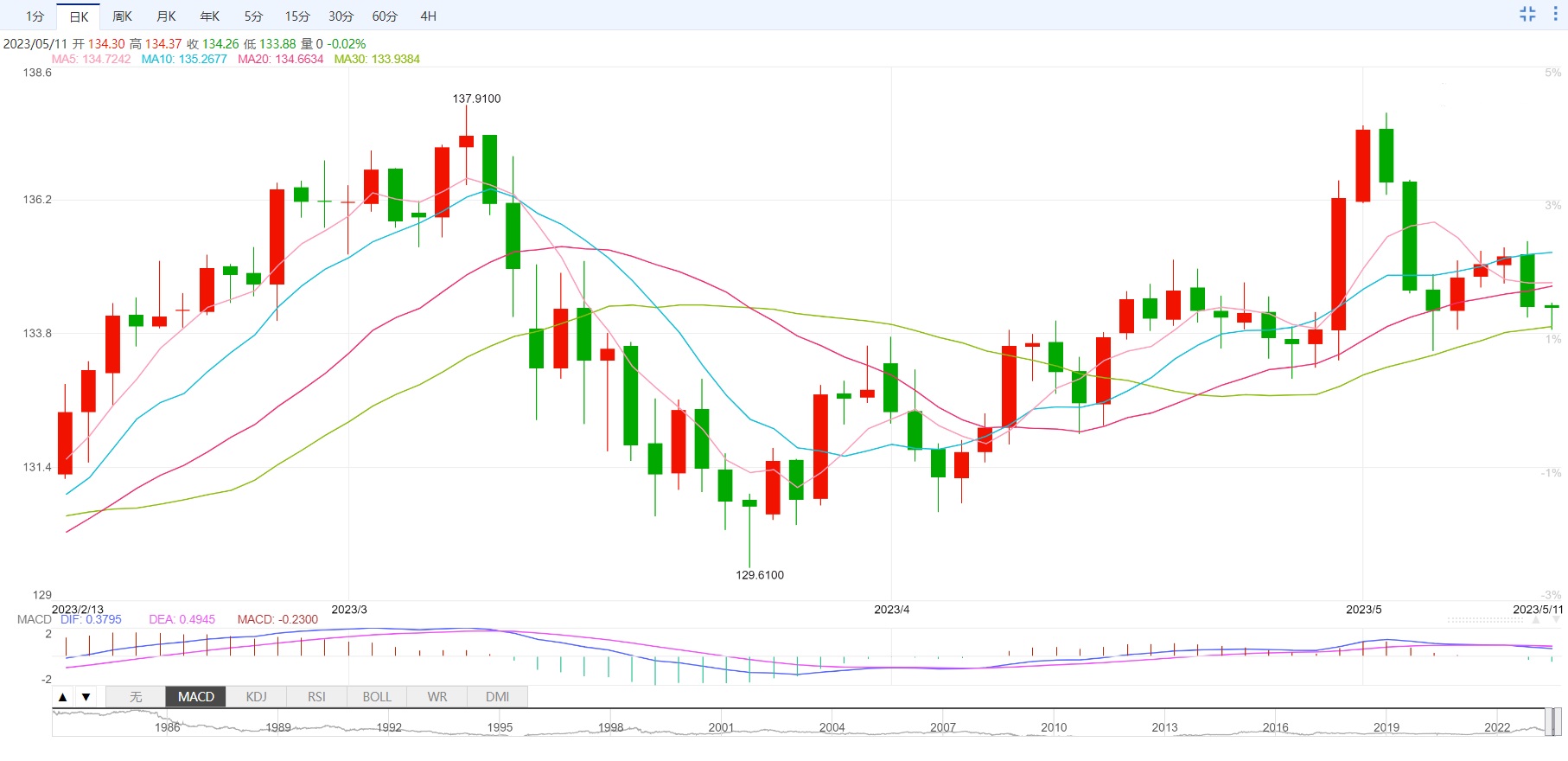 东京交易时段,美元兑日元倾向于追踪的10年期美国公债收益率下滑至3.4252%,隔夜在美国公布4月消费者物价同比涨幅两年来首次放缓至5%以下后,10年期美债收益率下跌8个基点。