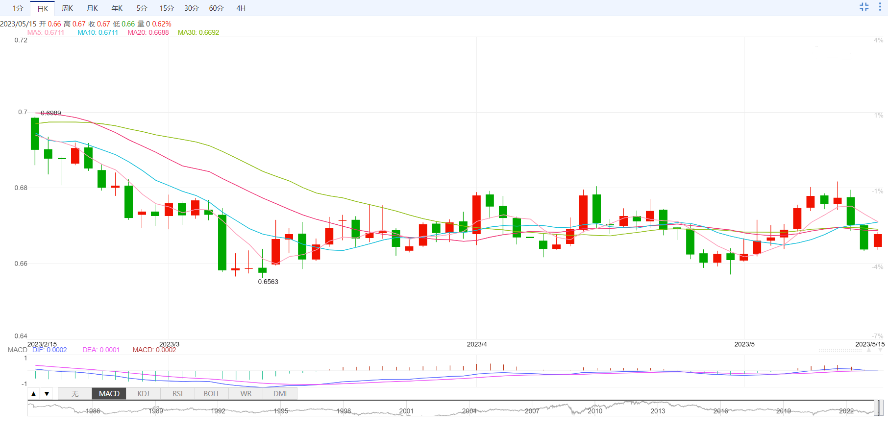 澳元一度上涨0.54%至0.6676;上周跌1.6%,创两个月来最大单周跌幅,并触及两周低点0.6637。澳元现在在200日移动均线切入位0.6723面临关键阻力,4月低点0.6573美元存在支撑。