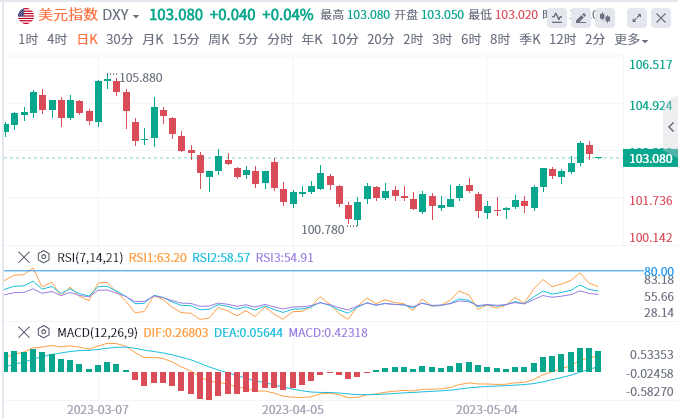 美元指数:截止发稿,美元指数交投于103.08附近。美元上周五下跌,此前美联储主席鲍威尔讲话采取了适度鸽派的立场,与市场预期相反。他称鉴于信贷条件收紧的情况,美联储可能不需要加息那么多。提高联邦政府31.4万亿美元债务上限的谈判暂停也对美元构成压力。但令市场感到意外的是鲍威尔。技术面上,尽管最近出现了疲软,但美元指数空头仍需要100-DMA支撑的验证,约为102.85,重新取得控制权。