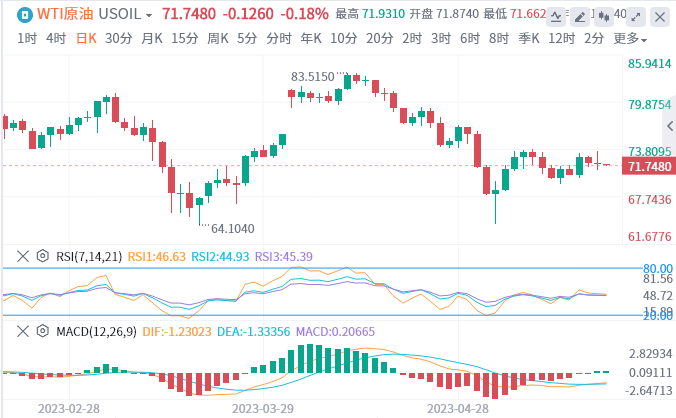 周一亚盘,原油交投于71.748附近。油价上周五由升转跌,此前美国众议院共和党人和总统拜登的政府暂停了有关提高举债上限的谈判,令可能削减能源需求的违约风险增加。美联储主席鲍威尔上周五称通胀“远高于”美联储的目标,并补充说尚未就下一次利率行动做出任何决定。这也让市场感到不安。在关于债务上限谈判暂停的报道和鲍威尔的评论之后,美国股市、美债收益率和美元都走低。