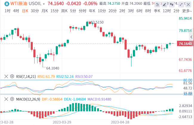 周四亚盘,原油交投于74.16附近。油价周三上涨2%,此前美国原油库存意外大幅减少,且沙特能源大臣发出警告,提升了OPEC+进一步减产的前景。美国能源信息署(EIA)稍早表示,进口下降之际,上周美国原油库存意外骤降1250万桶至4.552亿桶。分析师曾预计会增加80万桶。EIA称,汽油库存上周下降210万桶,至2.163亿桶,馏分油库存减少60万桶,至1.057亿桶。 今年的阵亡将士纪念日假期落在5月29日,该假期传统上标志着美国夏季旅游高峰的开始。