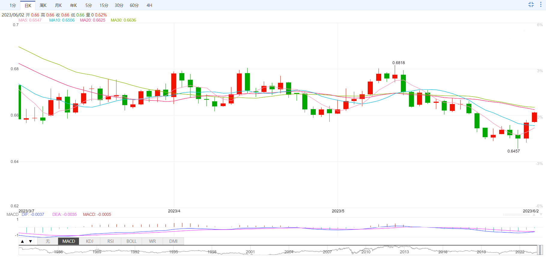 澳元兑美元多头继续占主导,该货币对于週五欧市开盘前在0.6615附近刷新本周高点。美元广泛下跌以及澳大利亚乐观的工资数据提振该货币对, 同时忽略澳洲联储的政策转向担忧。美国国会批准债务上限议案也增强该货币对的最新上涨。