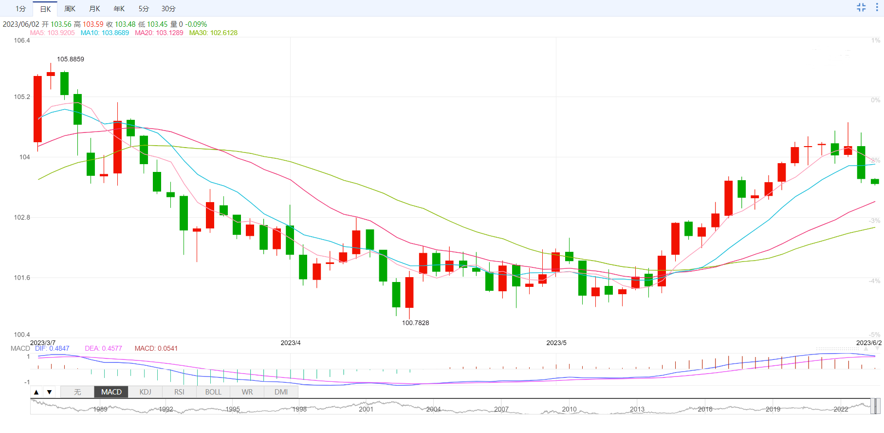 支撑位:103.92 103.62 103.23