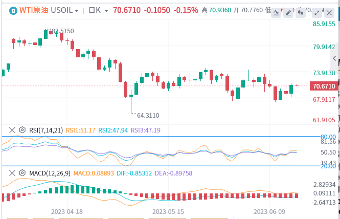 周五亚盘,原油交投于70.67附近。油价周四上涨约3%,达到一周高点,因美元走软,以及最大原油进口国中国的炼油厂加工量跃升。在美国,衡量炼油利润率的汽油裂解价差达到2022年7月以来最高。同时,美国柴油期货上涨约5%,达到4月底以来最高。周四公布的数据显示,中国5月炼油厂加工量同比增长15.4%,创史上第二高水平。科威特国家石油公司(KPC)的首席执行官说,中国石油需求预计将在今年下半年以有保证的速度继续攀升