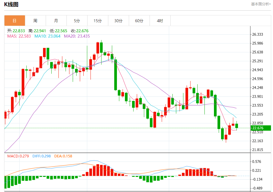 现货白银:截止北京时间20:29,现货白银下跌,现报22.693,跌幅0.58%。纽市盘前,银价在23.00水平以下盘整,现在提供新的负面交易,等待更多的下跌走向我们的下一个负面目标22.25。