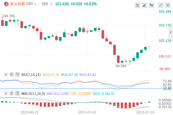 周二亚盘,黄金交投于1954.48附近。金价周一在狭窄区间内交投,交易商正在为美联储本周普遍预期的加息以及未来货币政策线索做准备。美元指数上涨了0.2%,限制了黄金的上涨空间,以欧元计价的黄金日内早些时候创下7月5日以来最高,此前的数据显示欧元区7月商业活动萎缩程度远超预期