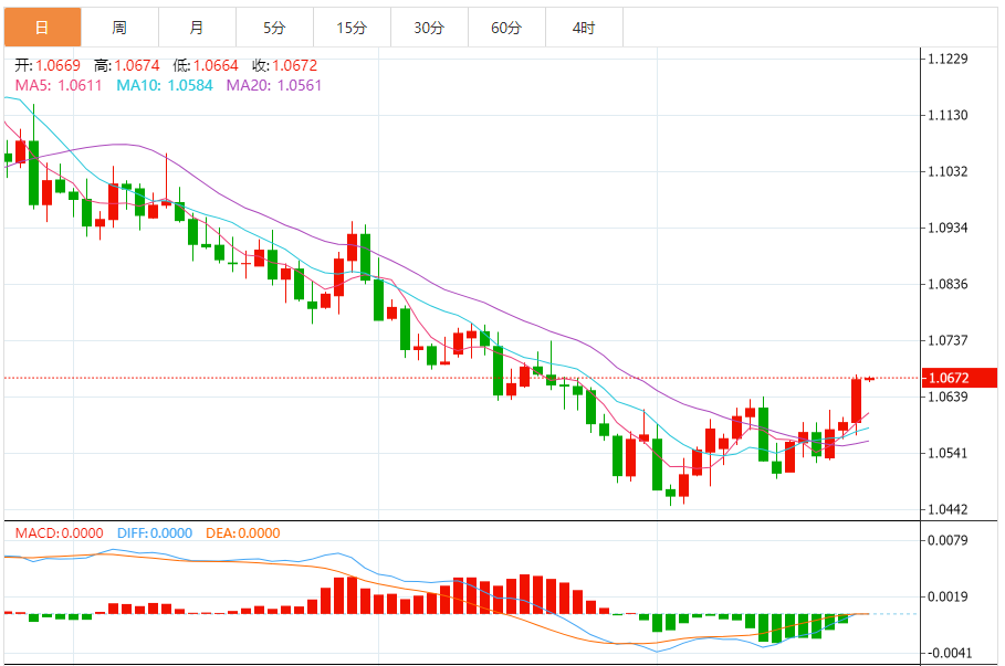 欧元:欧元/美元上涨,收报1.0668,涨幅0.71%。技术面上,汇价上行的初步阻力位于1.0707,进一步阻力位于1.0745,关键阻力位于1.0813;汇价下行的初步支撑位于1.0601,进一步支撑位于1.0533,更关键支撑位于1.0495。