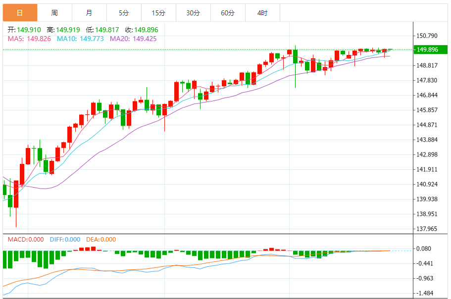 日元:美元/日元收高,收报149.908,涨幅0.14%。技术面上,汇价上行的初步阻力位于150.121,进一步阻力位150.329,关键阻力位于150.728;汇价下行的初步支撑位于149.514,进一步支撑位于149.115,更关键支撑位于148.907。