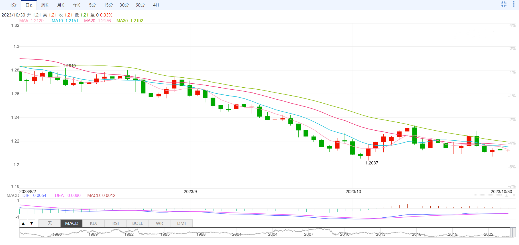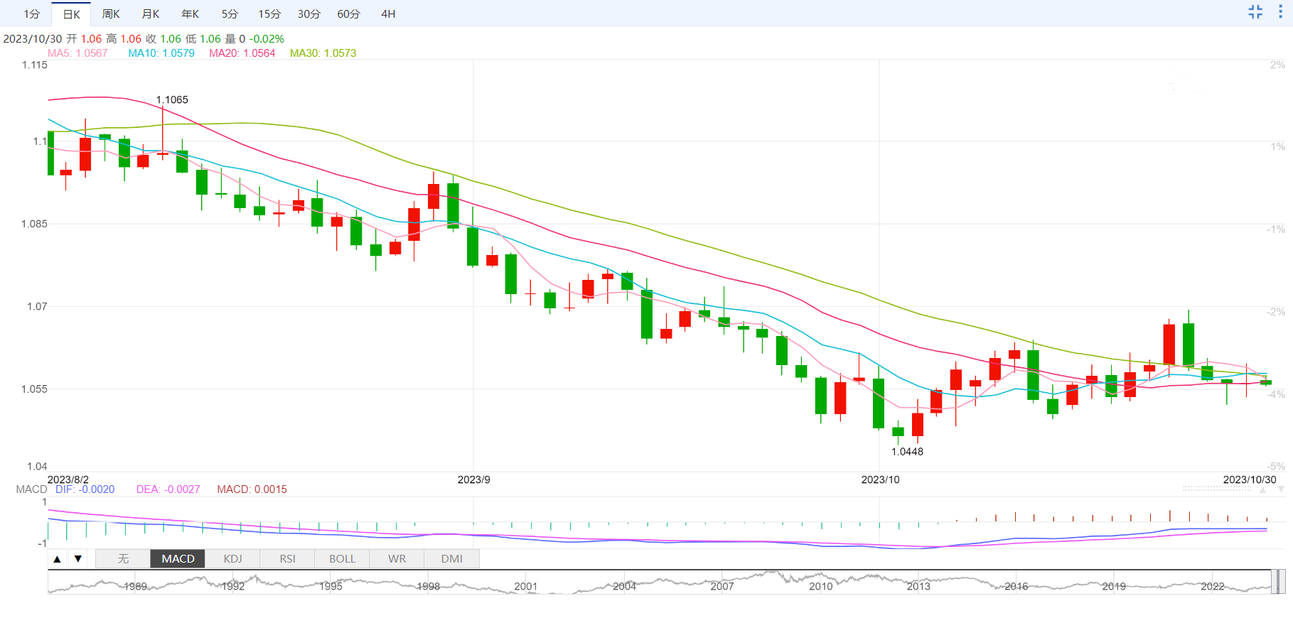 美元指数:截止发稿,美元指数上涨,现报106.59,涨幅0.02%。欧市盘前,尽管美联储首选的通胀指标——美国核心个人消费支出指数(PCE)仍远高于2%的目标利率,但预计美联储将在周三为期两天的会议结束时维持利率不变。美联储官员表示,最近的经济数据表明,经济活动正在稳步增长,而就业市场依然强劲。这些乐观的报告提高了对12月会议进一步加息的预期,这可能暂时提振美元。