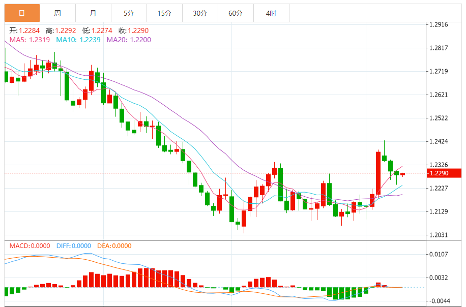 英镑:英镑/美元下跌,收报1.2283,跌幅0.13%。技术面上,汇价上行的初步阻力位于1.2310,进一步阻力位于1.2336,关键阻力位于1.2371;汇价下行的初步支撑位于1.2250,进一步支撑位于1.2215,更关键支撑位于1.2189。