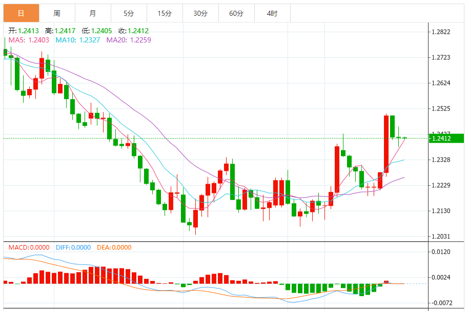 英镑:英镑/美元下跌,收报1.2413,跌幅0.01%。技术面上,汇价上行的初步阻力位于1.2454,进一步阻力位于1.2493,关键阻力位于1.2532;汇价下行的初步支撑位于1.2375,进一步支撑位于1.2336,更关键支撑位于1.2296。