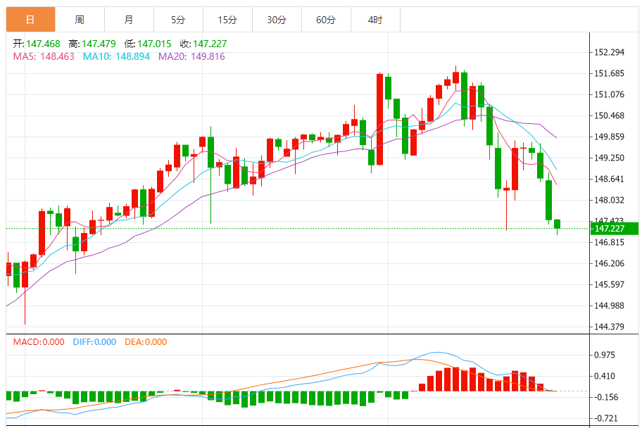 日元:美元/日元收跌,收报147.471跌幅0.81%。技术面上,汇价上行的初步阻力位于148.397,进一步阻力位149.339,关键阻力位于149.879;汇价下行的初步支撑位于146.915,进一步支撑位于146.375,更关键支撑位于145.433。