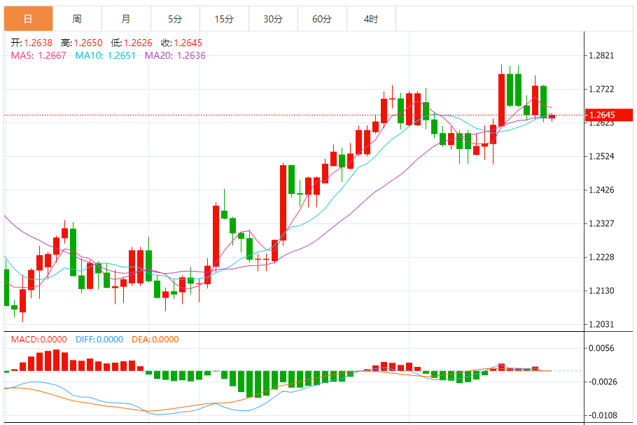 英镑:英镑/美元下跌,收报1.2637,跌幅0.74%。技术面上,汇价上行的初步阻力位于1.2707,进一步阻力位于1.2775,关键阻力位于1.2817;汇价下行的初步支撑位于1.2597,进一步支撑位于1.2556,更关键支撑位于1.2487。
