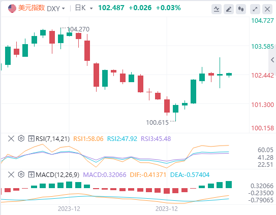因市场在12月非农数据和PMI数据公布后调整鸽派押注,美元目前交投于102.40附近,略有下跌。从上次FOMC会议的迹象来看,美联储的鸽派立场显而易见。