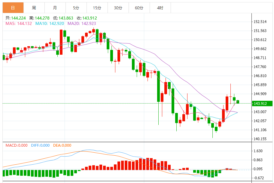 日元:美元/日元下跌,收报144.226,跌幅0.26%。技术面上,汇价上行的初步阻力位于144.857,进一步阻力位145.524,关键阻力位于146.124;汇价下行的初步支撑位于143.59,进一步支撑位于142.99,更关键支撑位于142.323。