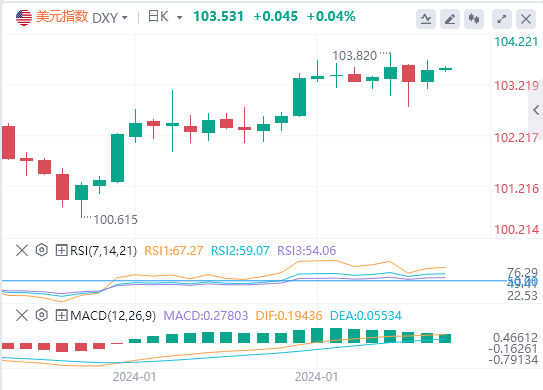 周四,由于美国第四季度经济增长大超预期,或暗示美联储更不急于降息。美元指数在美盘时段大幅上行,盘中一度涨至103.68的日内高点,截至目前,美元报价103.531。