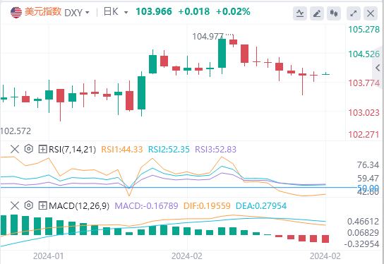 上周五,美元指数录得近两个月来周线下跌,盘中反弹触及104点未果,最终惊险收涨0.003%,报103.94。截至目前,美元报价103.96。