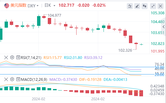 上周五,美元指数亚盘和欧盘维持区间震荡,后因关国2月失业率意外上升,美盘大幅跳水,但在高于预期的非农就业人口数据的支撑之下有所回升,最终收跌0.07%,报102.74。截至目前,美元报价102.717。