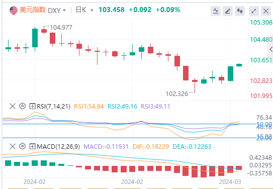 周四,因美国2月PPI增速大幅超过经济学家共识,录得去年八月以来的最大涨幅,美元指数大幅上涨,重回103关口,最终收涨0.542%,报103.37。截至目前,美元报价103.45。