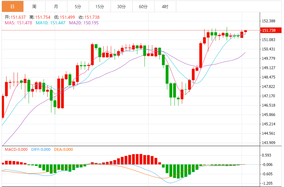 美元/日元4小时走势图显示,美元/日元继续尝试收于关键阻力位151.50-152.00之上。美国的经济数据可能成为推动美元/日元突破152.00水平的关键催化剂。关键问题是日本央行是否准备好捍卫152.00水平。如果美元/日元能够稳定在152.00上方,则可能获得强劲的上行动能并迈向155.00水平。