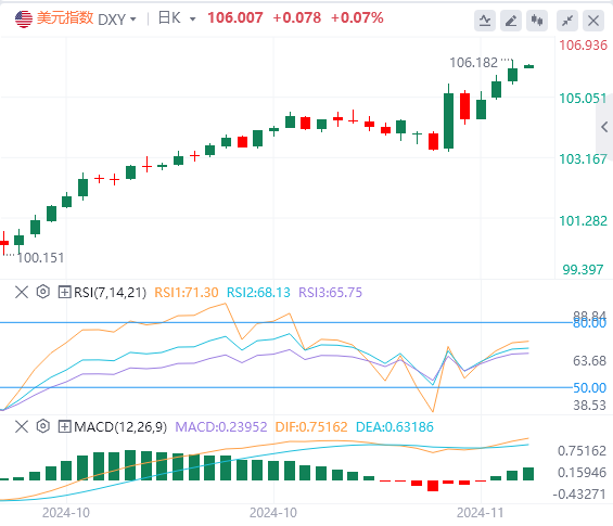 11月13日,北京时间周三亚市早盘,美元指数徘徊在106附近。周二,美元指数延续涨势,盘中最高触及106.182,最终收涨0.404%,报105.93。美债收益率集体飙升,基准的10年期美债收益率收报4.44%;对货币政策更敏感的两年期美债收益率收报4.363%。现货黄金连日下跌,一度失守2590美元/盎司,为9月以来首次,最终收跌0.81%,报2598.41美元/盎司,创近两个月新低。现货白银最终收涨0.14%,报30.74美元/盎司。随着投资者消化欧佩克对需求增长的最新下调,国际原油低位震荡。WTI原油最终收跌0.29%,报67.84美元/桶;布伦特原油收跌0.31%,报71.61美元/桶。