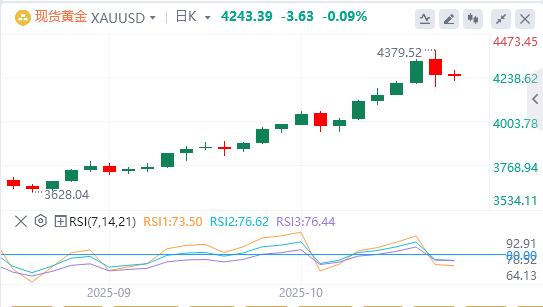 周五亚盘,黄金徘徊在4243.89附近。黄金小幅走低,因为近期破纪录的反弹似乎过度紧张,节日高峰过后实物需求有所缓解。交易员准备迎接周一晚些时候公布的中国第三季度国内生产总值(GDP)数据,以及9月份工业生产和零售销售报告。