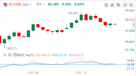 10月20日,北京时间周五亚市早盘,美元指数徘徊在98.49附近。上周五,特朗普软化了此前关于贸易的强硬立场,美元指数受到提振,最终收涨0.2%,报98.54,结束三连跌。基准的10年期美债收益率收报4.0140%,对美联储政策利率敏感的2年期美债收益率收报3.470%。现货黄金创下4379美元的历史新高后跳水近130美元,最终收跌1.75%,收报4250.93美元/盎司,但周线仍录得九连阳;现货白银亚盘再创新高,一度逼近54.50美元/盎司,随后转跌,一度失守51美元大关,最终收跌4.24%,报51.86美元/盎司。特朗普与普京计划在布达佩斯举行会晤,引发了结束俄乌冲突的希望,WTI原油最终收涨0.65%,报57.24美元/桶;布伦特原油最终收涨0.69%,报61.26美元/桶。