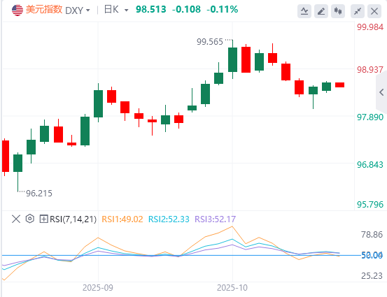10月21日,北京时间周二亚市早盘,美元指数徘徊在98.51附近。周一,美元指数维持震荡格局,最终小幅收涨0.06%,报98.60。基准的10年期美债收益率收报3.9850%,对美联储政策利率敏感的2年期美债收益率收报3.4640%。受美联储将进一步降息的预期和持续的避险需求提振,现货黄金突破上周五的纪录高位,触及4381.4美元/盎司,最终收涨2.46%,报4355.67美元/盎司;现货白银最终收涨1.01%,报52.39美元/盎司。因投资者担忧全球供应过剩的可能性,油价周一收于5月初以来的最低水平。WTI原油最终收跌0.56%,报56.92美元/桶;布伦特原油最终收跌0.62%,报60.95美元/桶。