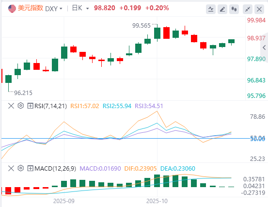 周一,美元指数维持震荡格局,最终小幅收涨0.06%,截至目前,美元报价98.82。